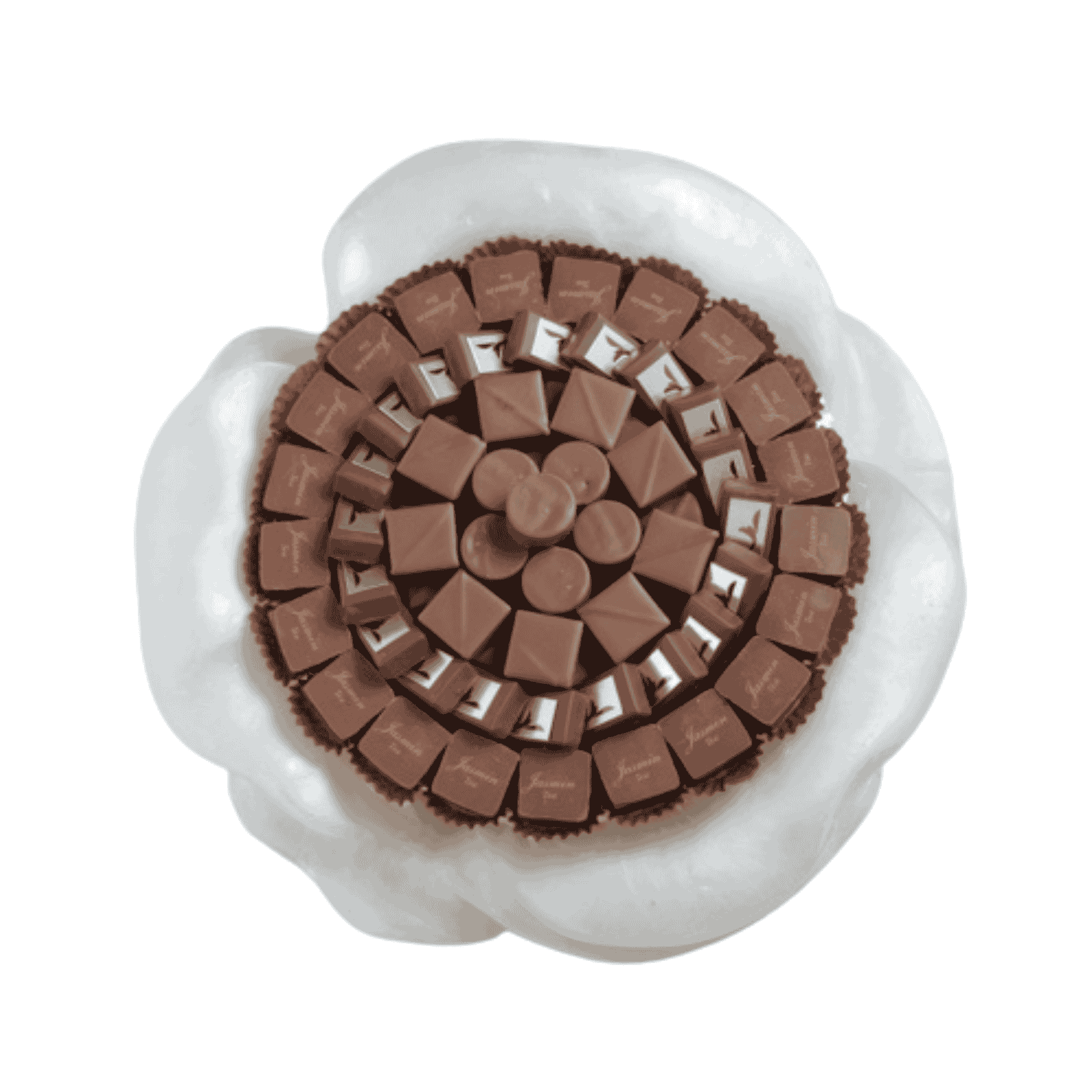 A delicate chocolate tray in the shape of an elegant rose, containing a luxurious assortment of chocolate pieces, a blend of art and refined taste, ideal for gifts and upscale occasions.